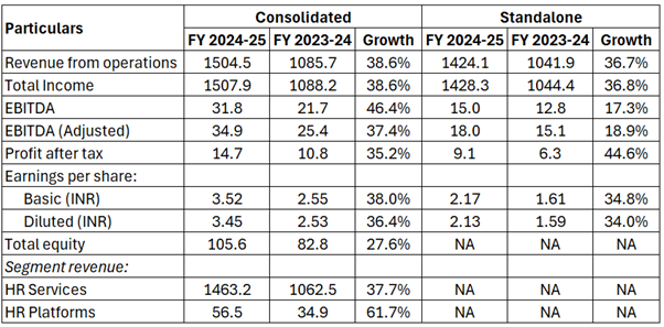 CIEL HR Services continues to maintain a robust financial performance for the year ended on 31 March 2025 (FY25). The company’s revenue from operations rose to Rs. 1504.5 Crores for FY25, as against Rs. 1085.7 Crores in FY24. The company’s profit after tax stood at Rs. 14.67 Crores for FY25, showcasing an impressive growth of 35+% YoY vis-a-vis Rs. 10.85 Crores in the previous financial year.